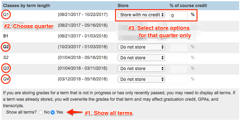 Classes by term length section is used to target the quarter to insert grades and graduation credit for completed classes.