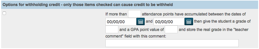 Options for withholding credit - only those items checked can cause credit to be withheld section is used to withhold graduation credit for poor attendance. Normally, you would not use this section and leave the box unchecked.